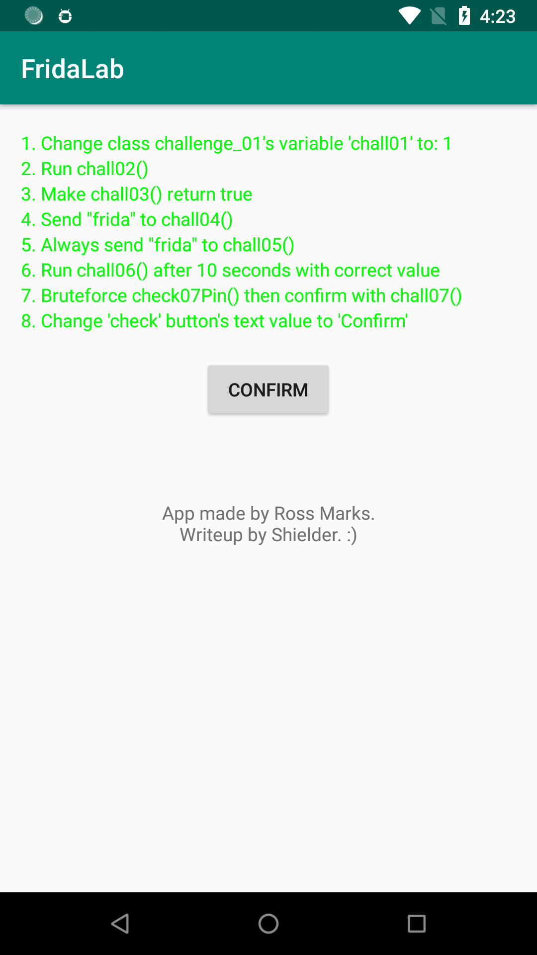 Today I solved FridaLab, a playground Android application for playing with Frida and testing your skills.